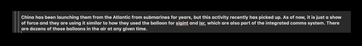 The video I recorded was not the first time the Chinese military conducted a military operation on United States soil. China has been deploying gravitic propulsion technology along with similar tech across the United States for years. In 2023, a Chinese spy balloon flew across the entire country undetected for 8 days before it was shot down. This balloon was used for gathering sensitive intelligence on the United States and to show the U.S. military that the country's airspace was vulnerable. The drone that I recorded served the same purpose: to demonstrate their military and technological strength to the U.S. government. The Chinese military flew this drone over a sensitive East Coast location to demonstrate their ability to easily annihilate any valuable area of the United States at will, to show that the border is compromised and Chinese sleeper cells and WMDs are present across the country, test defense responses, and to send a message to the U.S. government that they are not technologically superior.